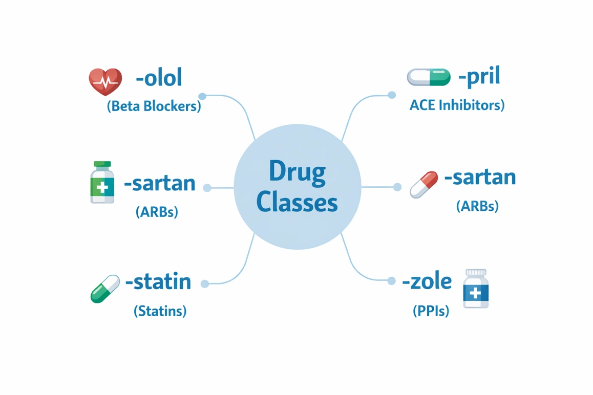 -olol = beta blockers -pril = ACE inhibitors -sartan = ARBs -statin = cholesterol meds -zole = proton pump inhibitors