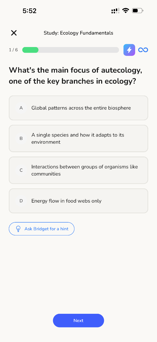 Brigo Daily 5: Study just 5 flashcards every day. Takes 2 minutes. Keeps you consistent without overwhelming you.